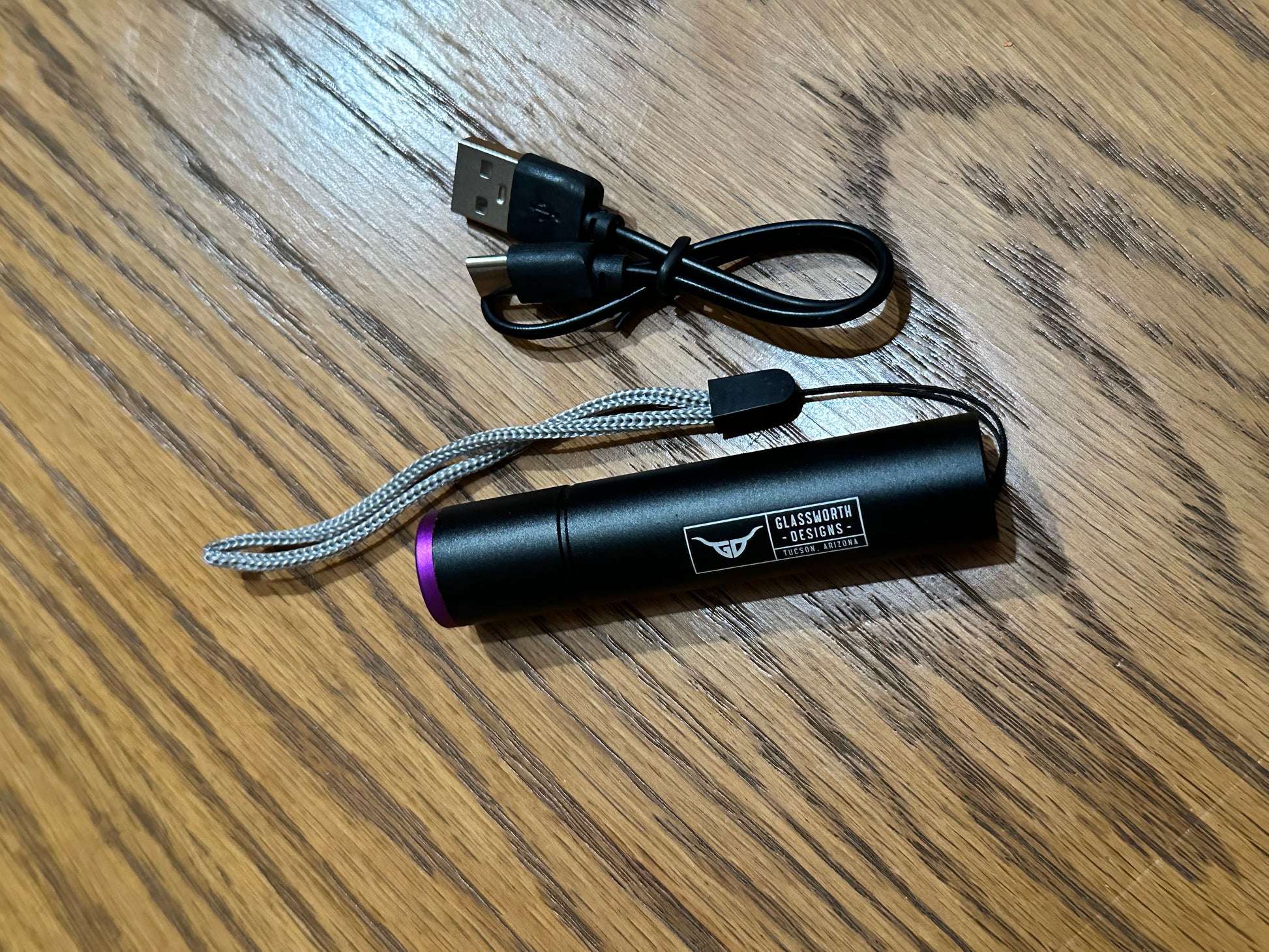 This Glassworth Designs UV flashlight is perfect for showing off your UV reactive glass collection! This UV light has a 365nm wavelength which will make your glass glow very bright! It has 2 different modes with high a low strength light. The battery is USB-C rechargeable and each product includes a charging cable.